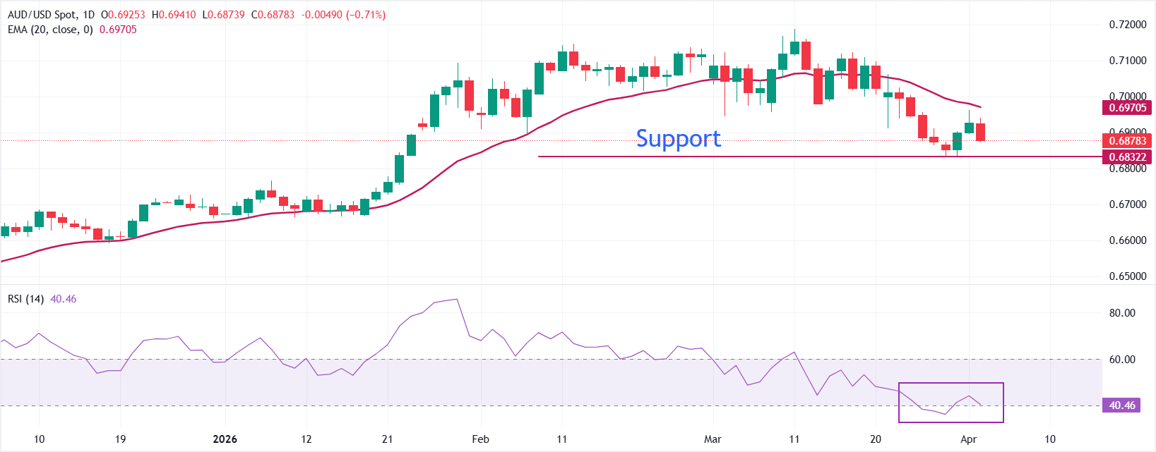 发稿时,澳元/美元大幅下跌至约0.6870。该货币对位于下降的20日指数移动均缐(EMA)下方,20日EMA约為0.6970,限制了反弹空间,并在3月底高点之后确立了短期看跌偏向。价格走势已转為一系列更低的高点和更低的收盘价,而14天相对强弱指数(RSI)难以维持在40.00以上,进一步强化了看跌偏向。