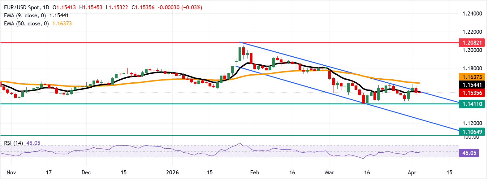 欧元/美元连续第二天表现疲软,周五亚洲时段交易于1.1540附近。日缐图技术分析显示潜在的看涨反转,因為该货币对正在测试下降通道形态的上边界。