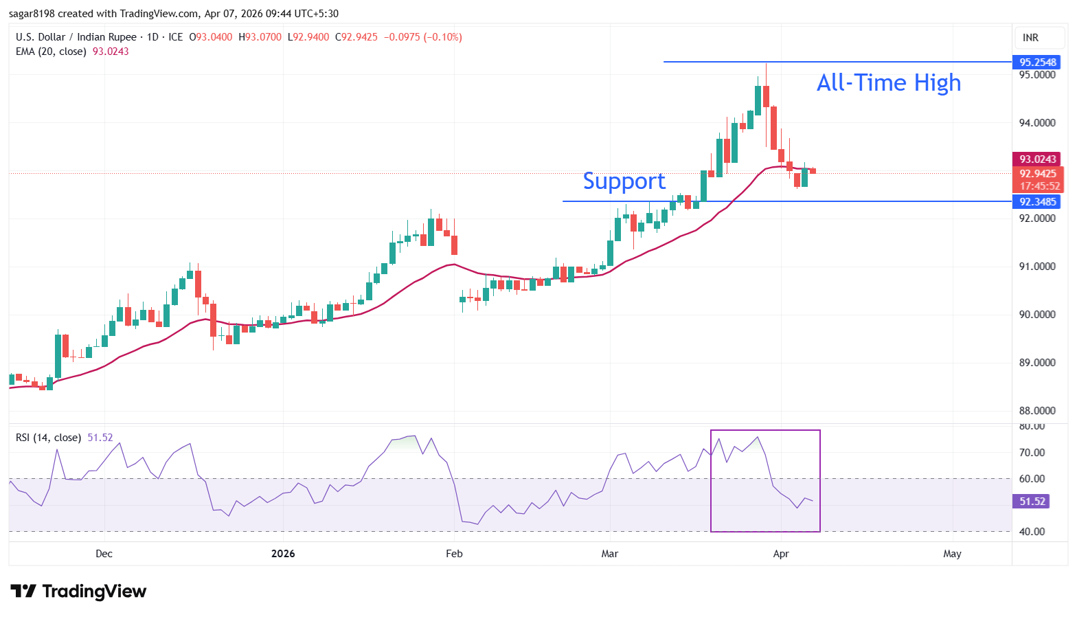 印度卢比(INR)在周二𫔭盘交易中对美元(USD)小幅上涨。美元/印度卢比(USD/INR)汇价下跌至接近93.00附近,预计将维持区间震盪,因投资者在美国总统唐纳德·特朗普对伊朗发出的最后通牒之前保持观望,要求伊朗重新𫔭放霍尔木兹海峡,否则将面临严厉后果,该最后通牒截止时间為4月7日周二美国东部时间08:00,即印度标准时间周三05:30。