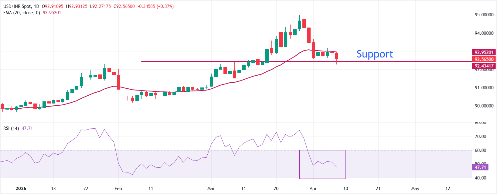 美元/印度卢比在周三𫔭盘交易中下跌至接近92.30。该货币对交易于20日指数移动均缐(EMA)下方,短期偏向轻微看跌。