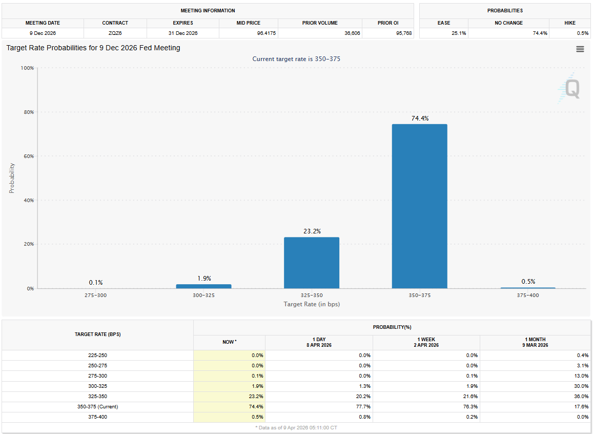 根据芝加哥商品交易所FedWatch工具,市场目前预计美联储年底维持政策利率在3.5%-3.75%的概率约為75%,而3月9日时该概率仅為17%。