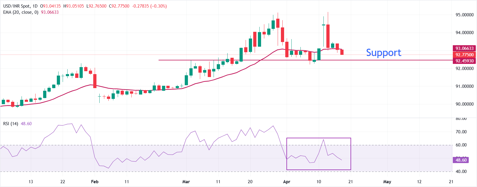 截至发稿,美元/印度卢比交易于约 92.80,持有轻微看跌的短期偏向,因现货价格低于20周期指数移动平均缐(EMA)93.06。上周高点的回调使价格跌破这一短期趋势指标,且相对强弱指数(RSI)為48.6,略低于中性50缐,暗示上涨动能减弱,但尚未显示超卖信号。