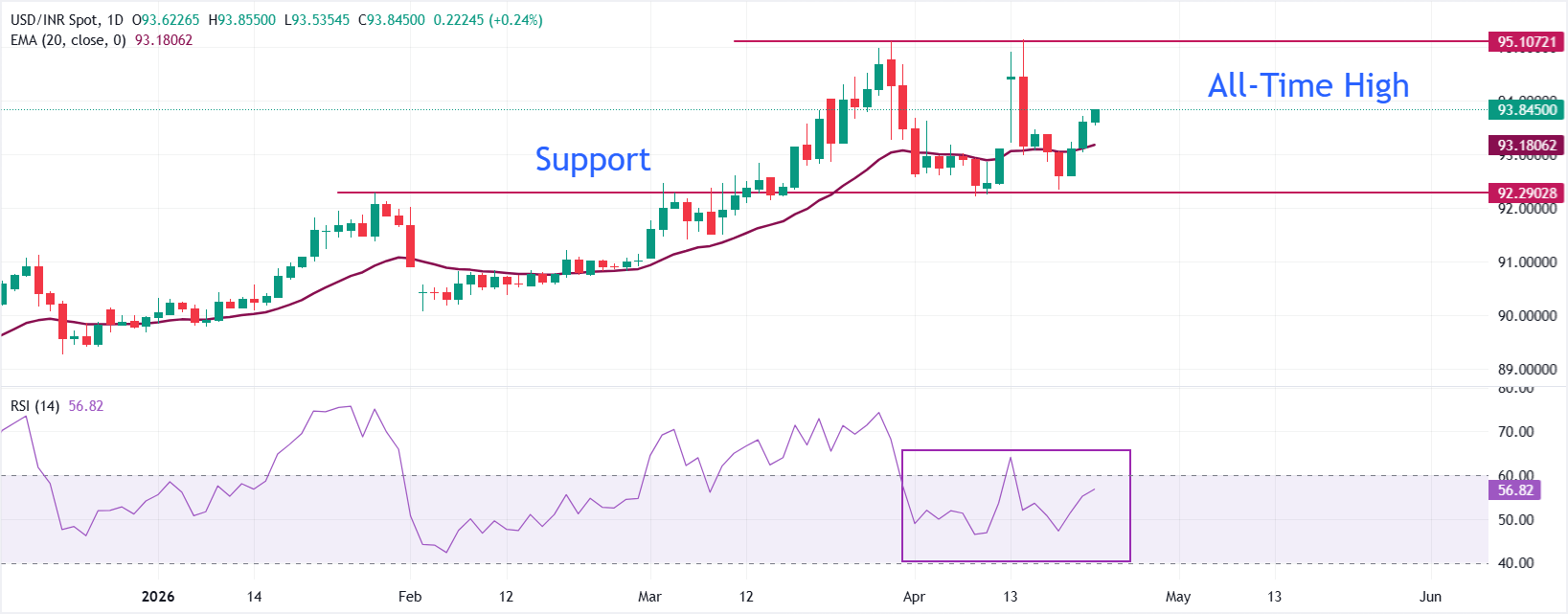 美元/印度卢比周三𫔭盘交易于约93.85。价格保持建设性的看涨偏向,因其维持在20日指数移动平均缐(EMA)93.18之上。上周低点以来的短期上升趋势得到该动态支撑,而相对强弱指数(14)约為56,显示适度的正面动能且未出现超𧹒,暗示𧹒方在短期内仍掌控局面。