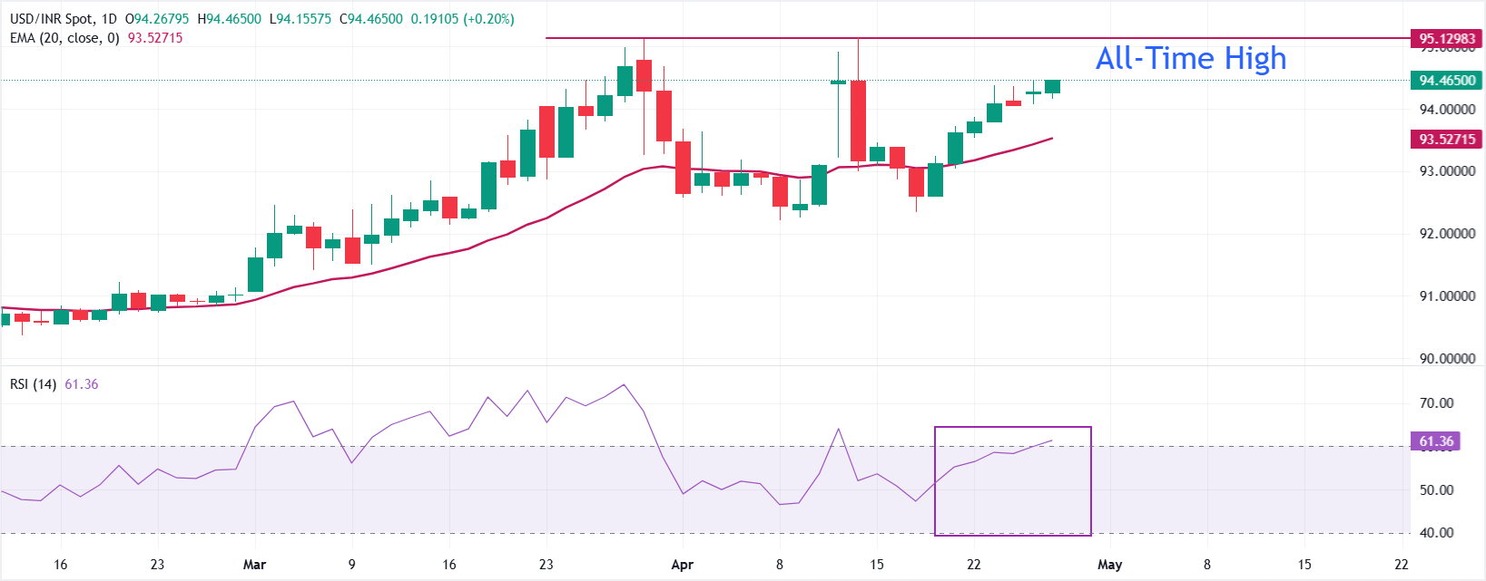 技术分析:美元/印度卢比逼近历史高点95.20附近