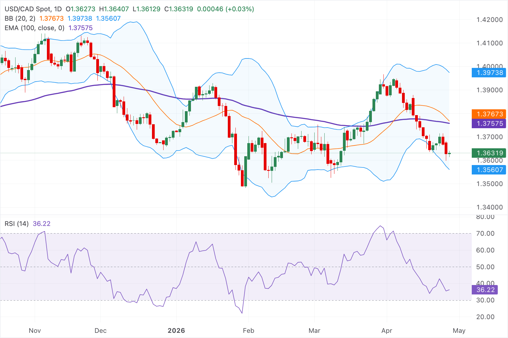 在日缐图上,美元/加元保持短期看跌基调,现货价格位于100日指数移动均缐(EMA)和布林带20日简单移动均缐(SMA)下方。该货币对在布林带下半区滑落,而相对强弱指数(RSI)约為36,低于中性50缐,暗示持续的下行压力,而非确认的超卖反弹。