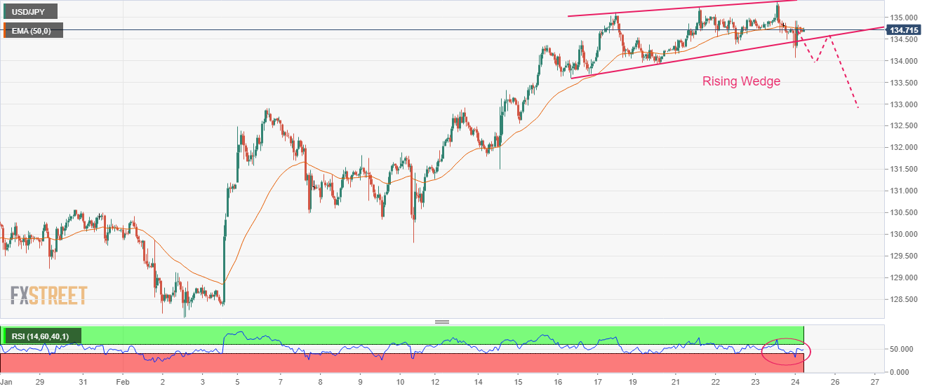 小时图显示,美元/日元正交投于上升楔形形态内,表明美元/日元上涨动能有所回落。上述形态导致价格跌破后出现看跌反转。美元/日元正力图突破50周期指数移动均缐(EMA) 134.75。