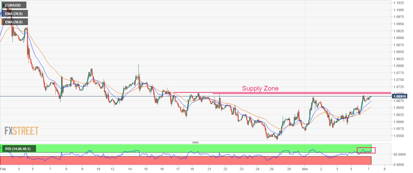 小时图显示,欧元/美元正上涨接近供应获1.0698-1.0705附近。由于欧元/美元上涨势头强劲,预计欧元/美元将重新夺回该水平。