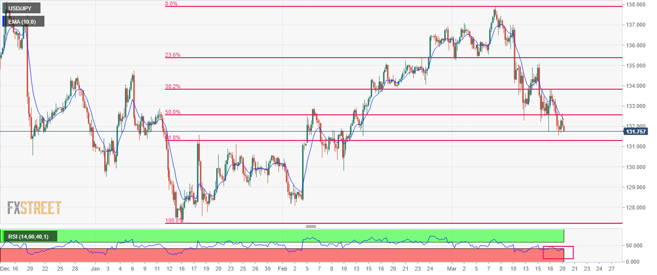 4小时图显示,美元/日元正下跌接近(从1月16日的低点127.22至3月08日的高点137.91)下降趋势61.8%斐波位131.30附近。
