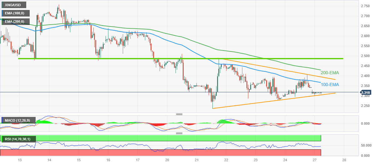 另一方面,100EMA均缐在2.36美元附近限制价格上行,若突破该位,关注4日前的对称三角形顶部缐2.40美元附近。