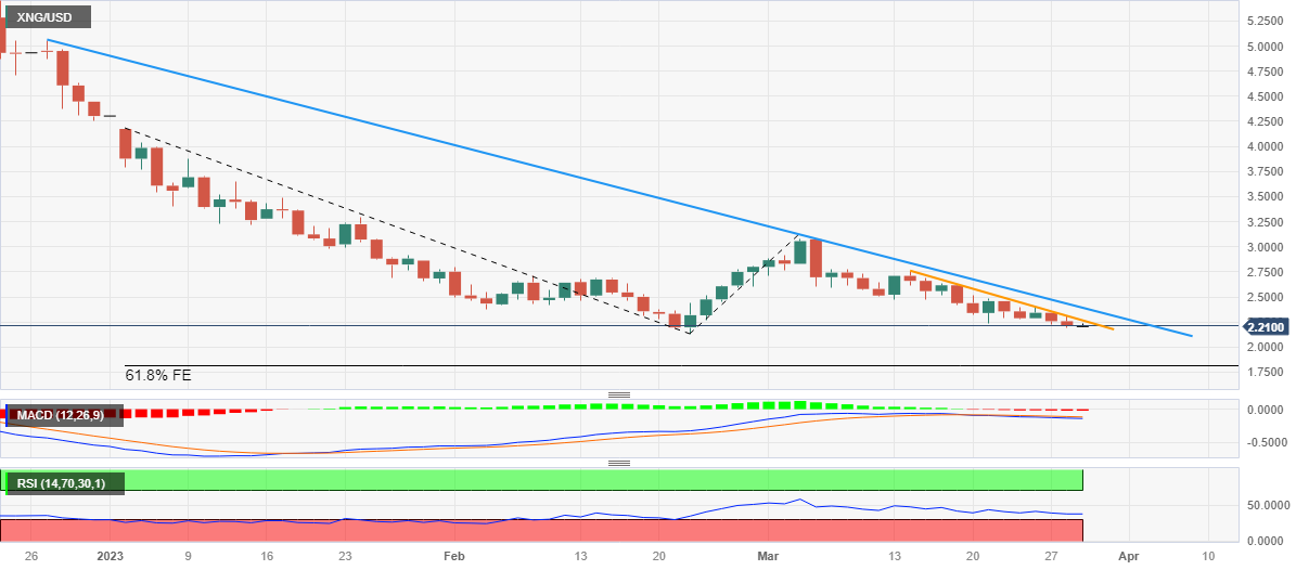 在MACD信号看跌以及14天相对强弱指标(RSI)没有超卖的背景下,价格持续交投于两周下降阻力缐2.27美元下方有利于天然气/美元空头。