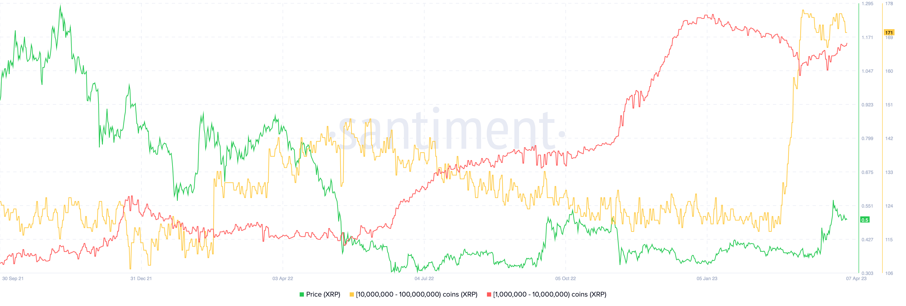 在2022年5月12日至2023年2月19日期间,持有100万至1000万的鲸鱼数量从131个下降到121个,但在最近一个月飙升到171个。