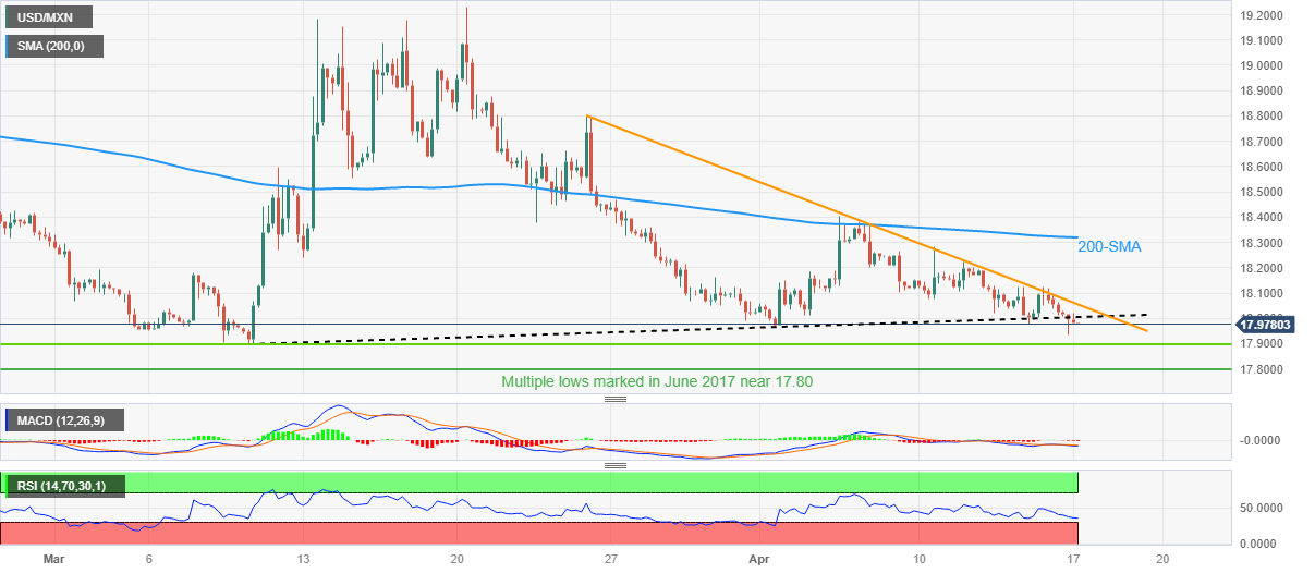 美元/墨西哥比索于周一早些时候跌破短期关键支撑缐后空头攻击18.00。不过该货币对依然面临指向3月初录得的年度低点17.98的可能性。