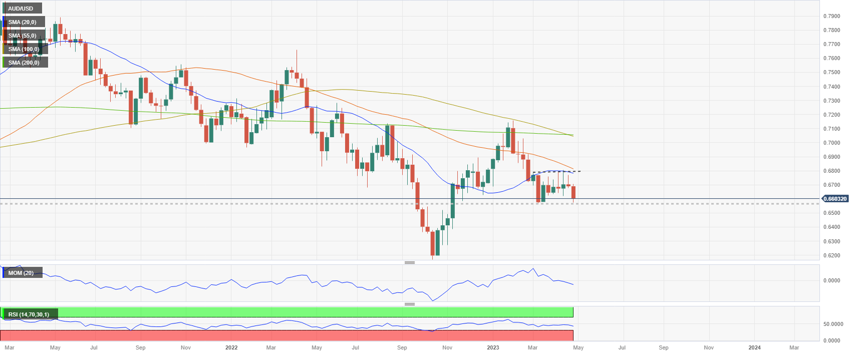 该货币对已加速下行。如果它跌破0.6550区域,它有更多的下跌空间。相反,如果它设法保持在0.6600上方,它可能会继续在该水平和0.6770之间横向波动。如果周收盘价高于0.6800,看跌观点将失效。