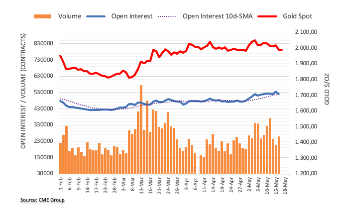 周二金价大幅回落之际未平仓合约萎缩,表明金价暂时不会进一步下跌。与此同时,预计该商品将在1970美元附近遇到下一个支撑位,这也是4月下旬低点和55日SMA均缐所在。