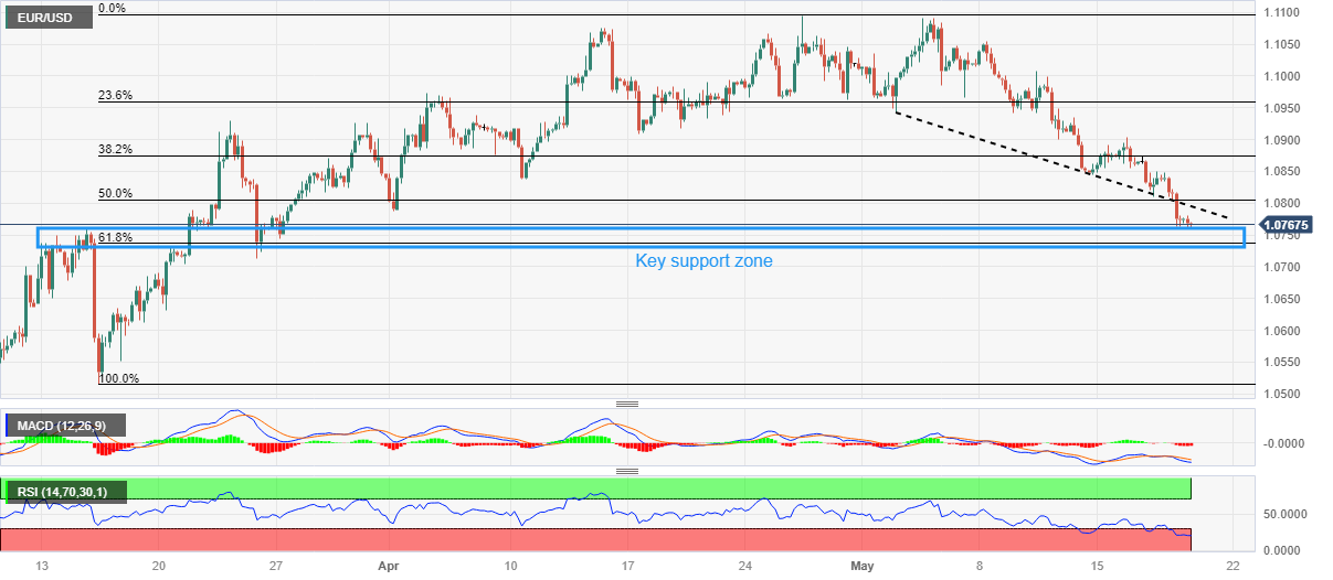 进入周五欧洲时段,欧元/美元依然承压于两个月最低水平,连续第四日下跌,欧元空头试探1.0750附近的短期关键支撑位。