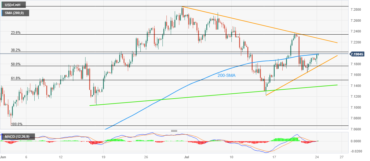值得注意的是,6 月 02-30 日上行趋势的 38.2% 斐波那契回撤位(7.2020 附近)将构成进一步上行过滤器,引导美元/离岸人民币𧹒方朝 6 月 30 日以来的关键阻力缐(7.2270 附近)进发。