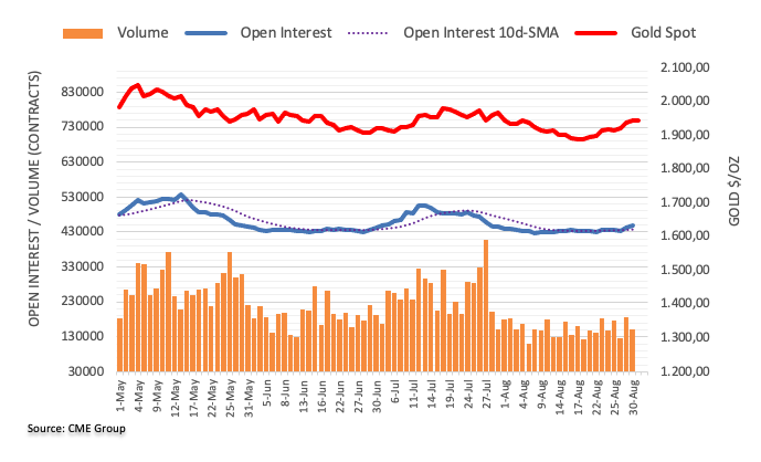 周三金价连续第三日上涨并徘徊于1950美元区域附近。金价当日上涨之际未平仓合约增长,表明短期内价格可能进一步上扬。下一个目标要注意7月20日高点1987美元/盎司。