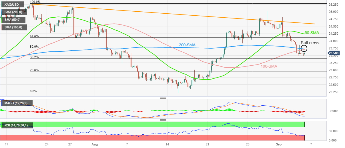 一旦多头设法突破23.75美元SMA均缐汇合处牛叉,银价将迅速上升至7-8月跌势的61.8%回档位24.15美元附近,然后為50SMA均缐24.25美元。