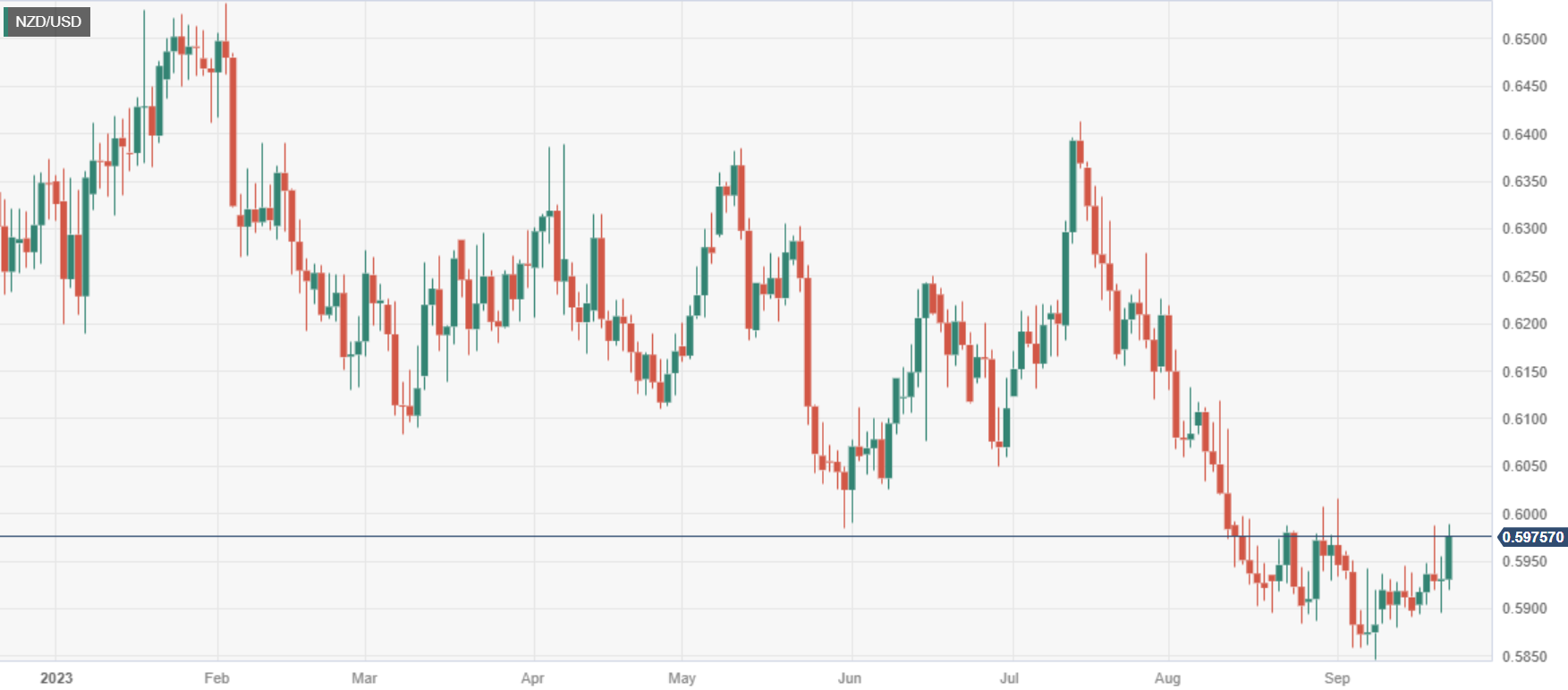 纽元/美元从日低 0.5919 反弹至 0.5977。